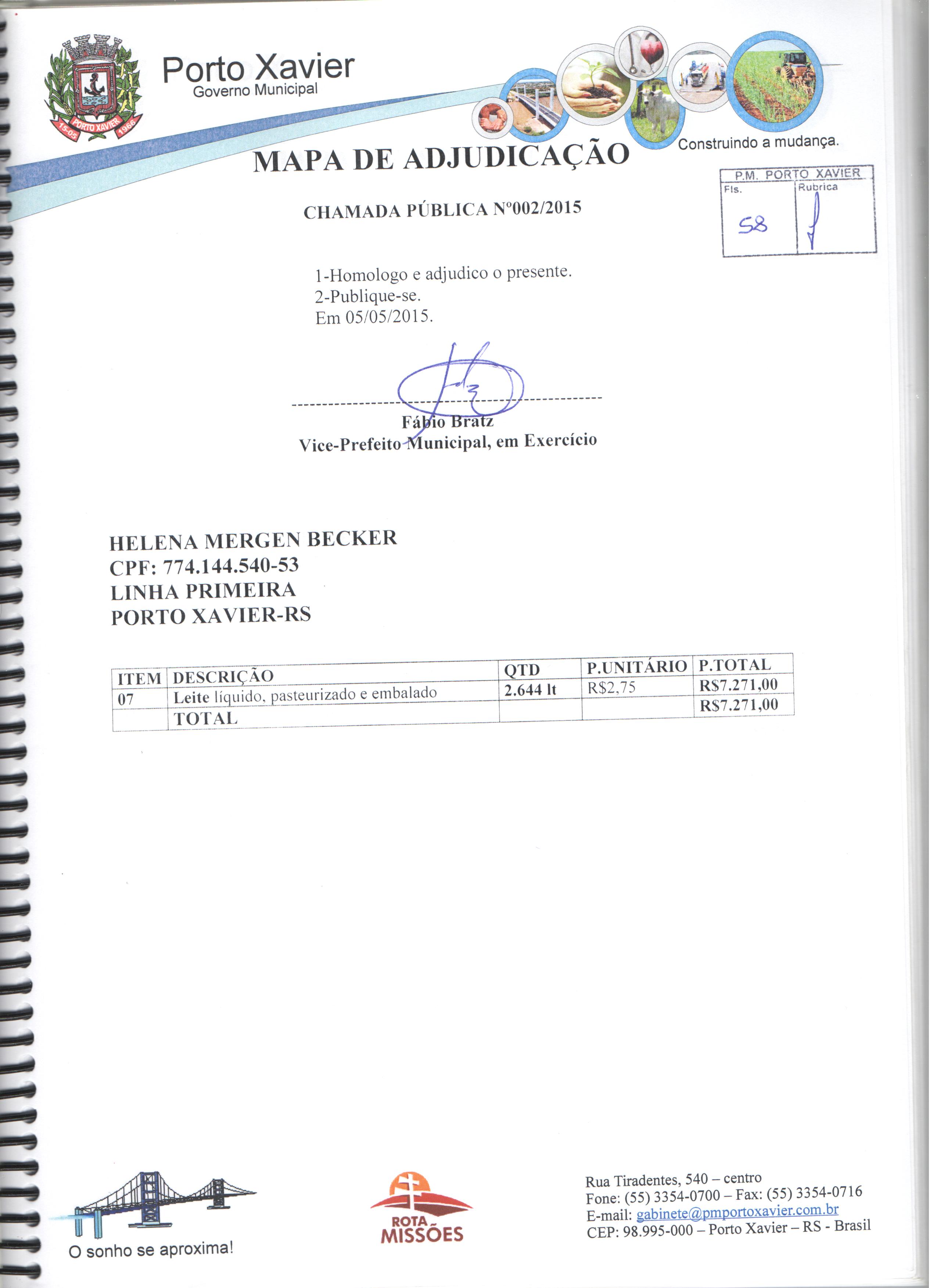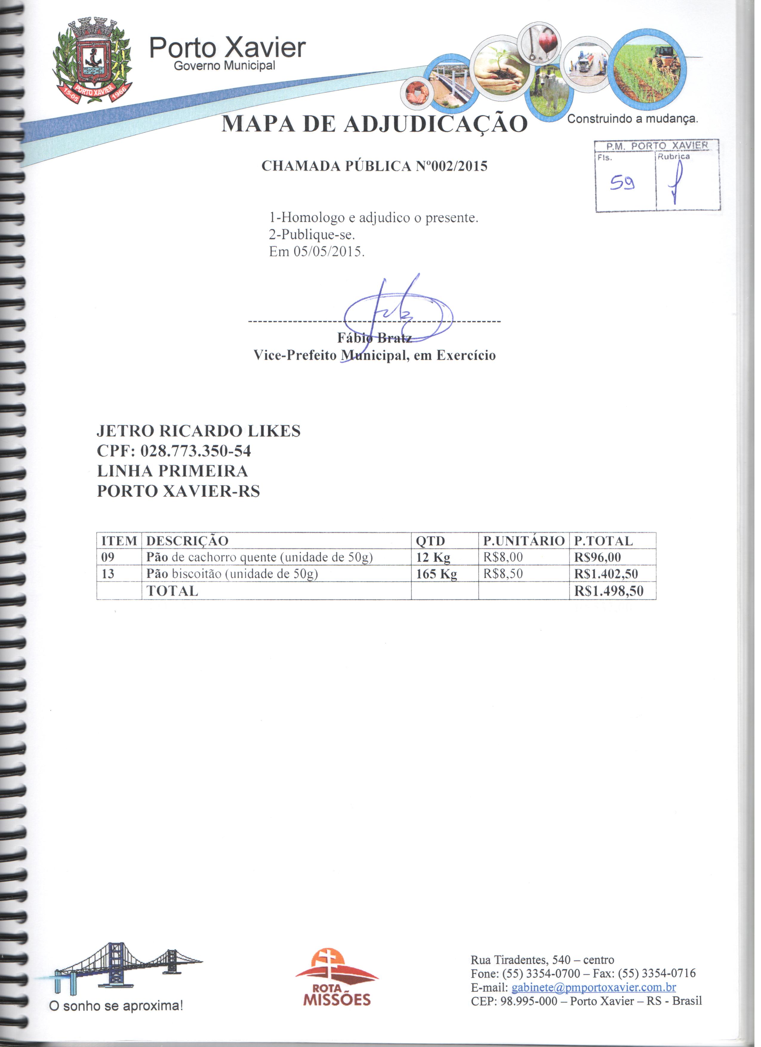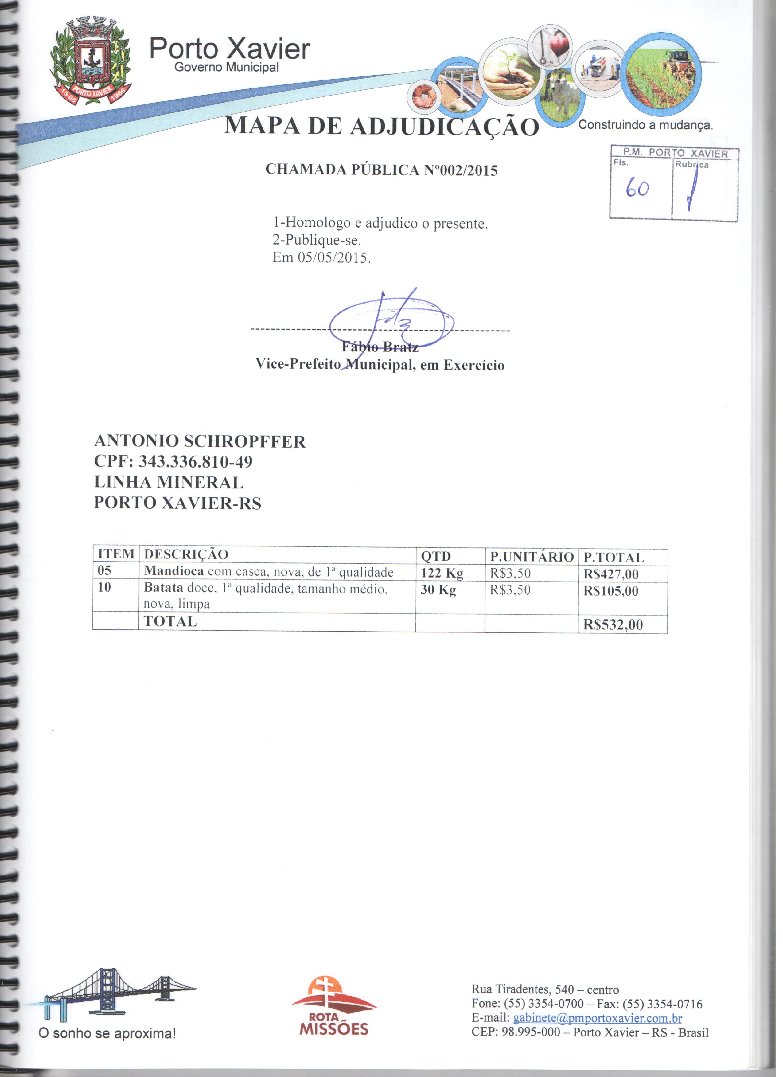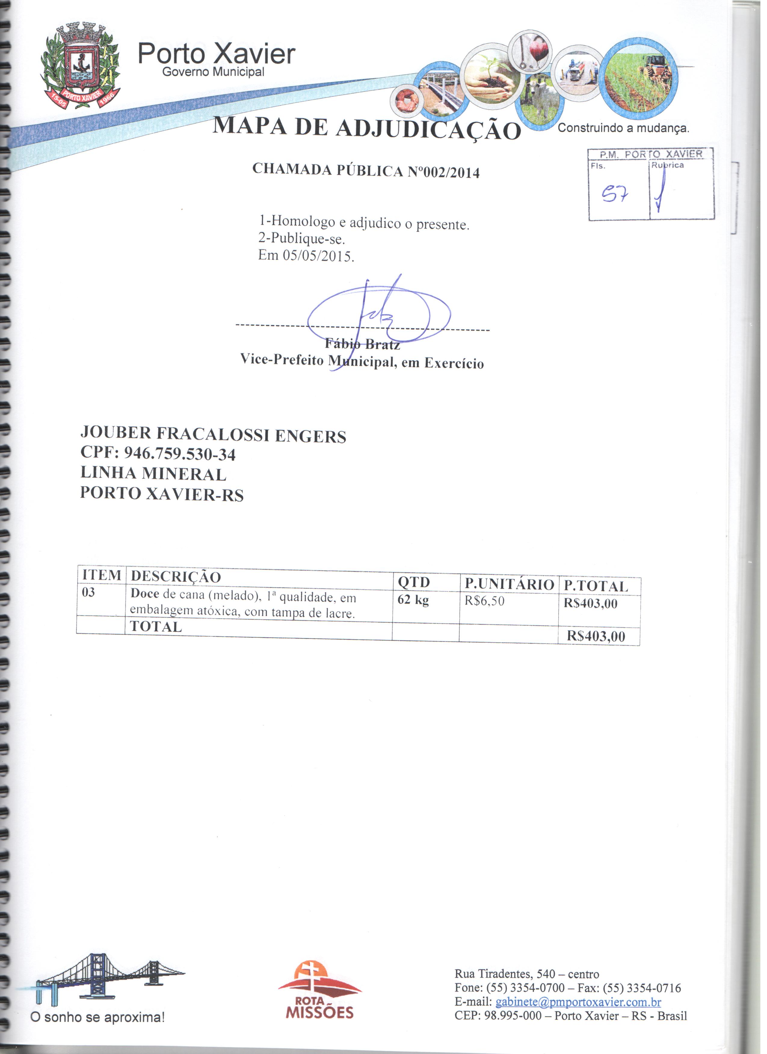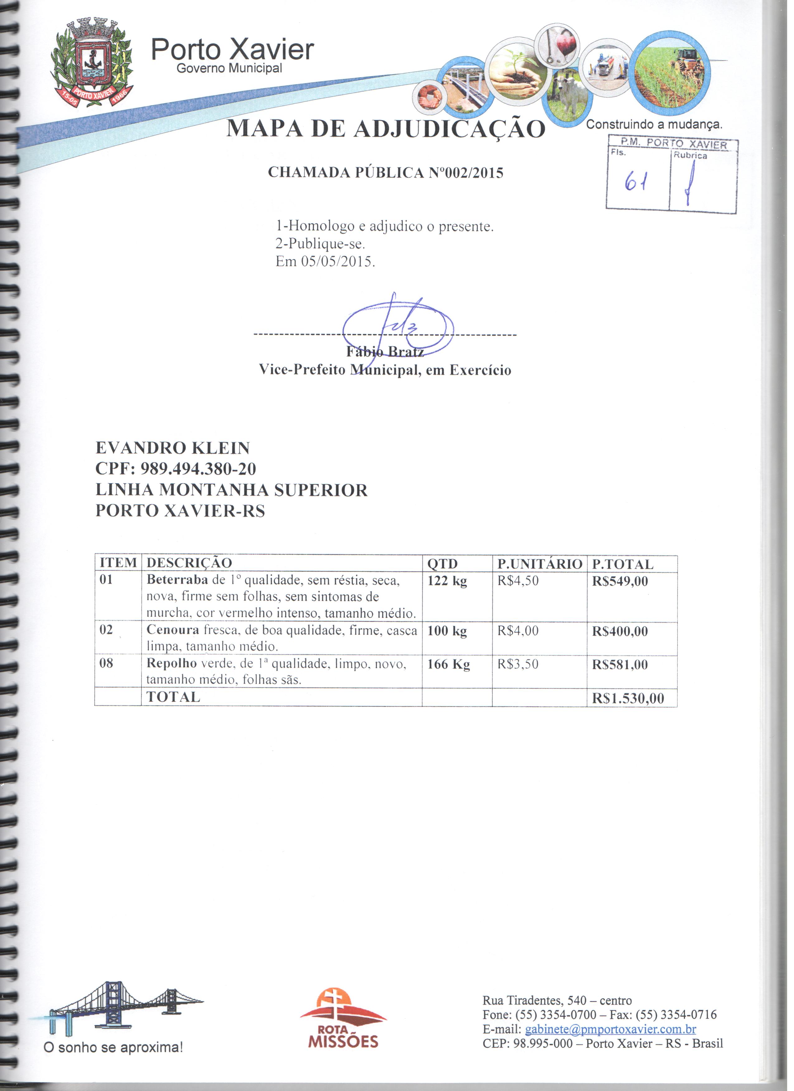 Descrição: Aquisição de gêneros alimentícios da agricultura familiar para atender os alunos matriculados nas escolas de Educação Infantil e Fundamental da Rede Pública Municipal e APAE de Porto Xavier/RS.