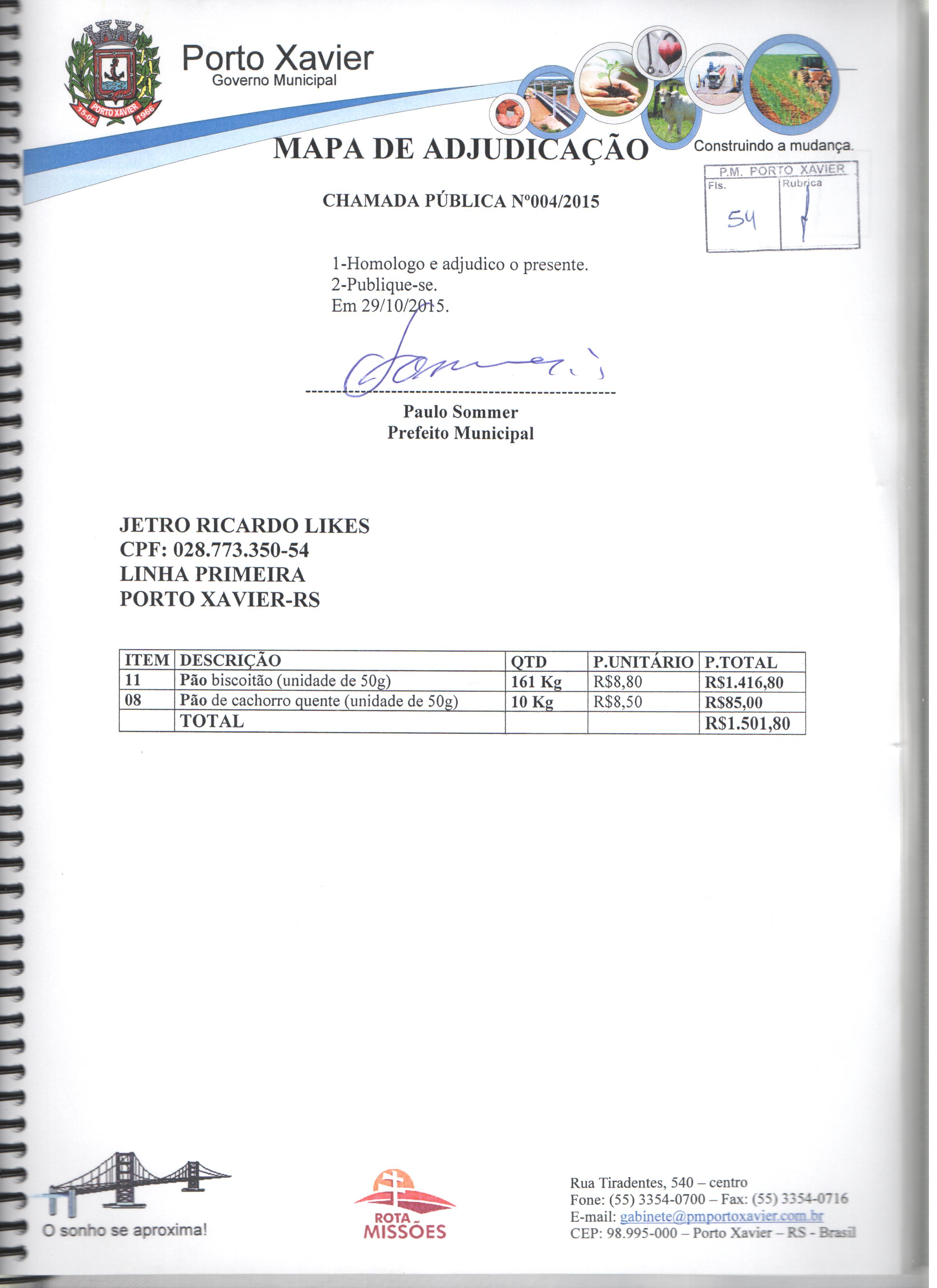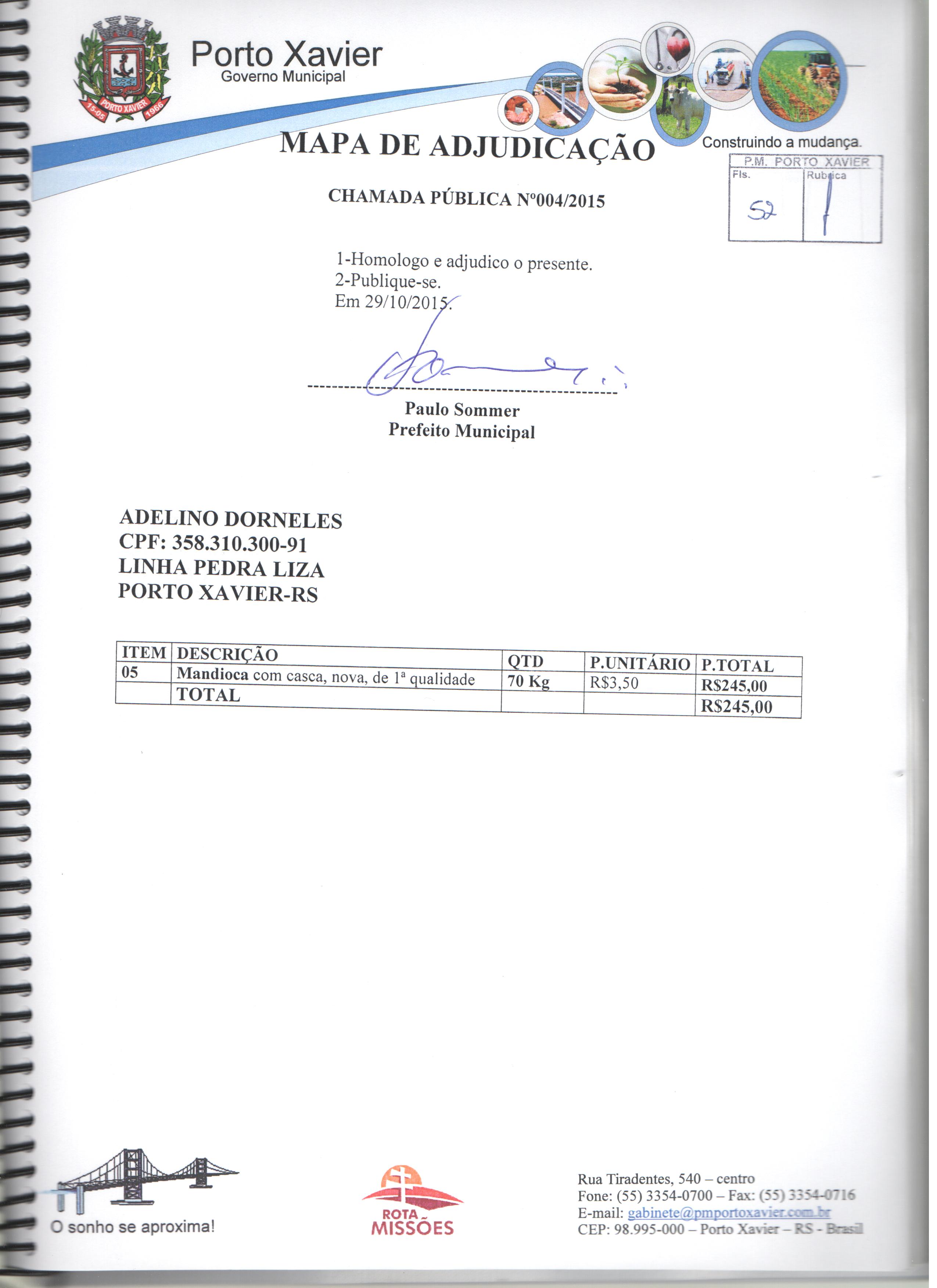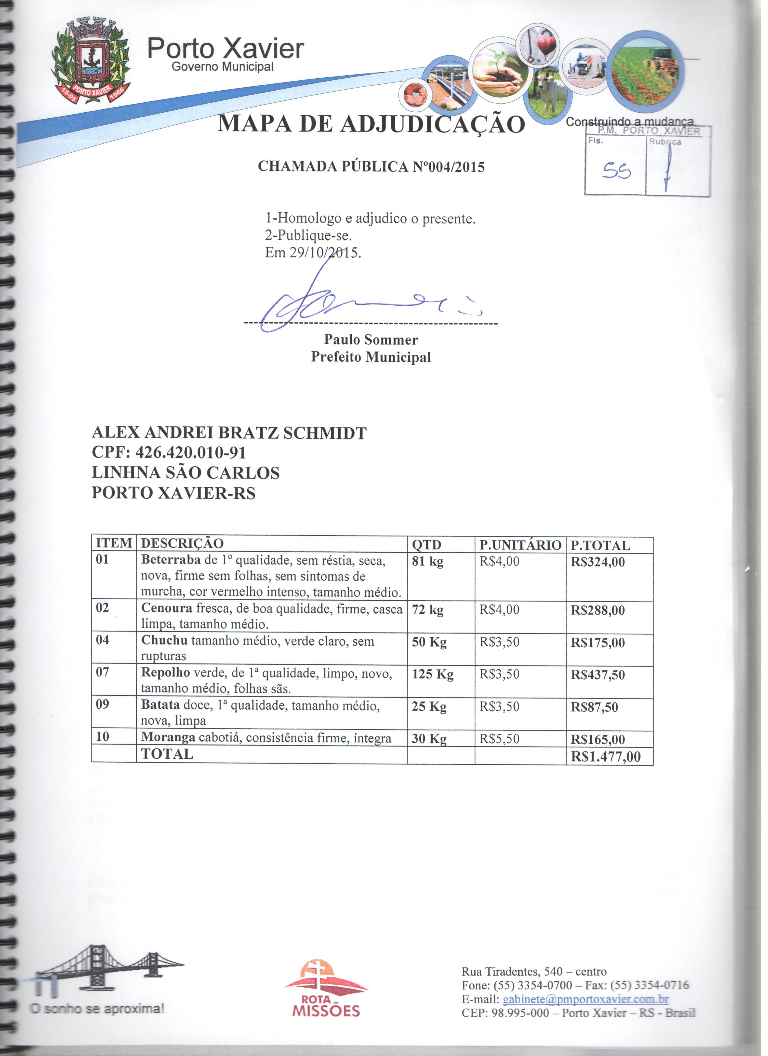 Descrição: Aquisição de gêneros alimentícios da agricultura familiar para atender os alunos matriculados nas escolas de Educação Infantil e Fundamental da Rede Pública Municipal e APAE de Porto Xavier/RS.