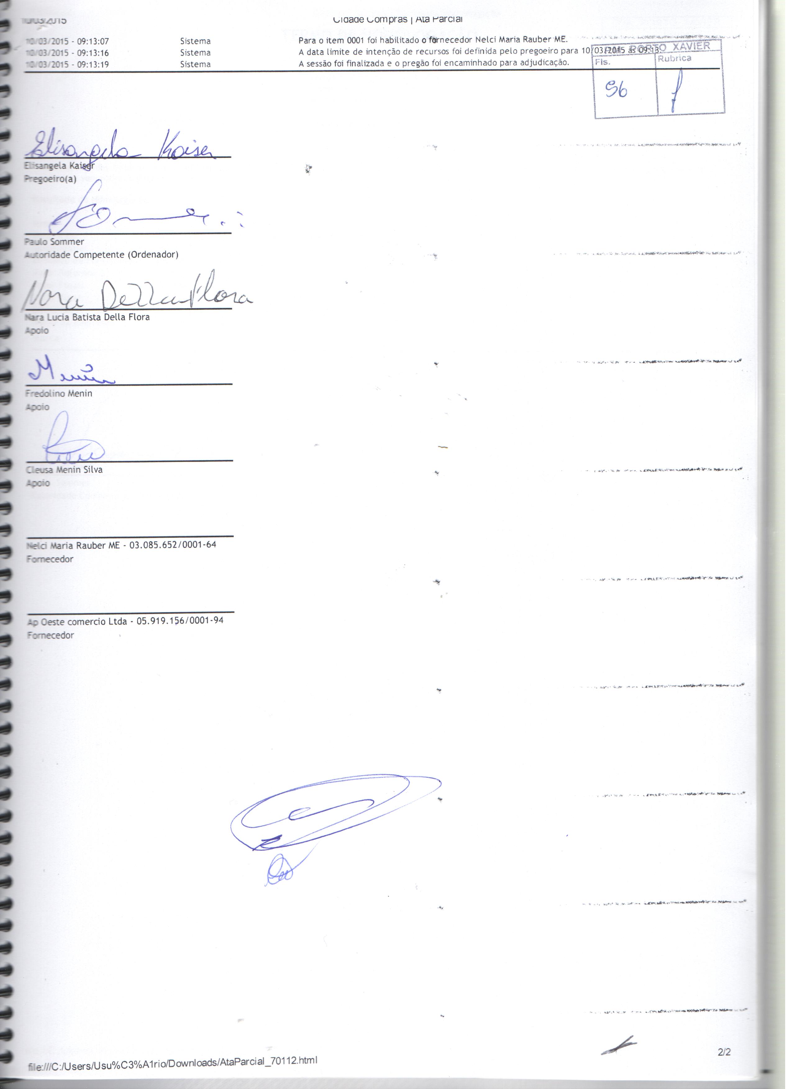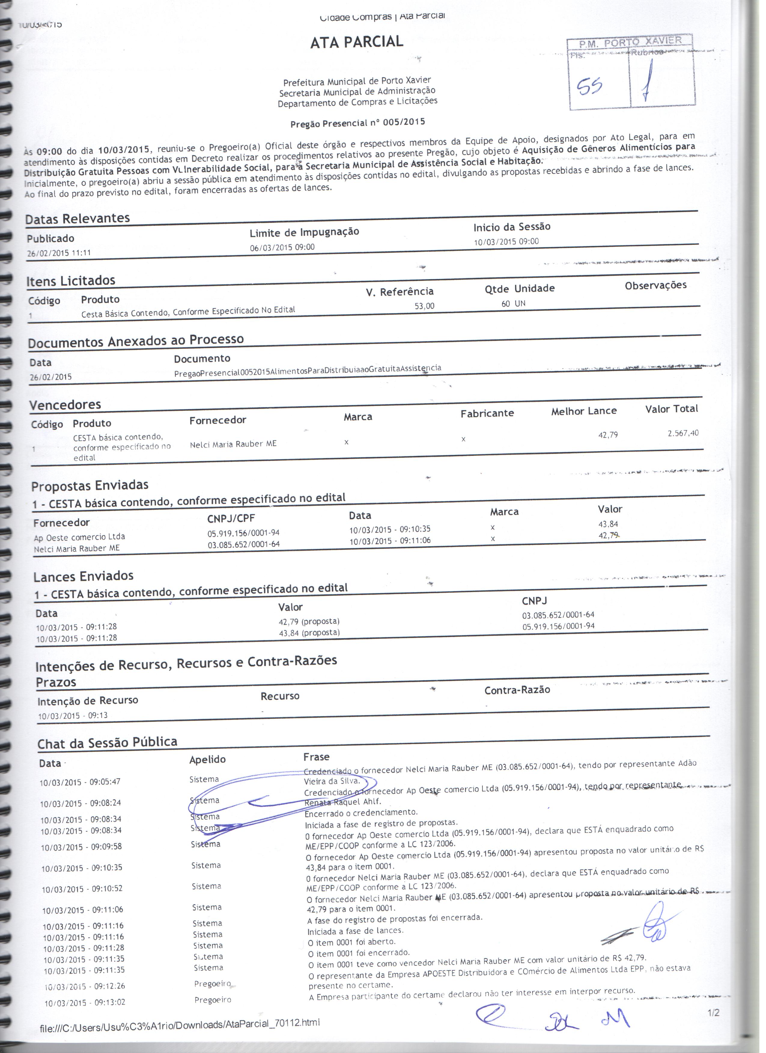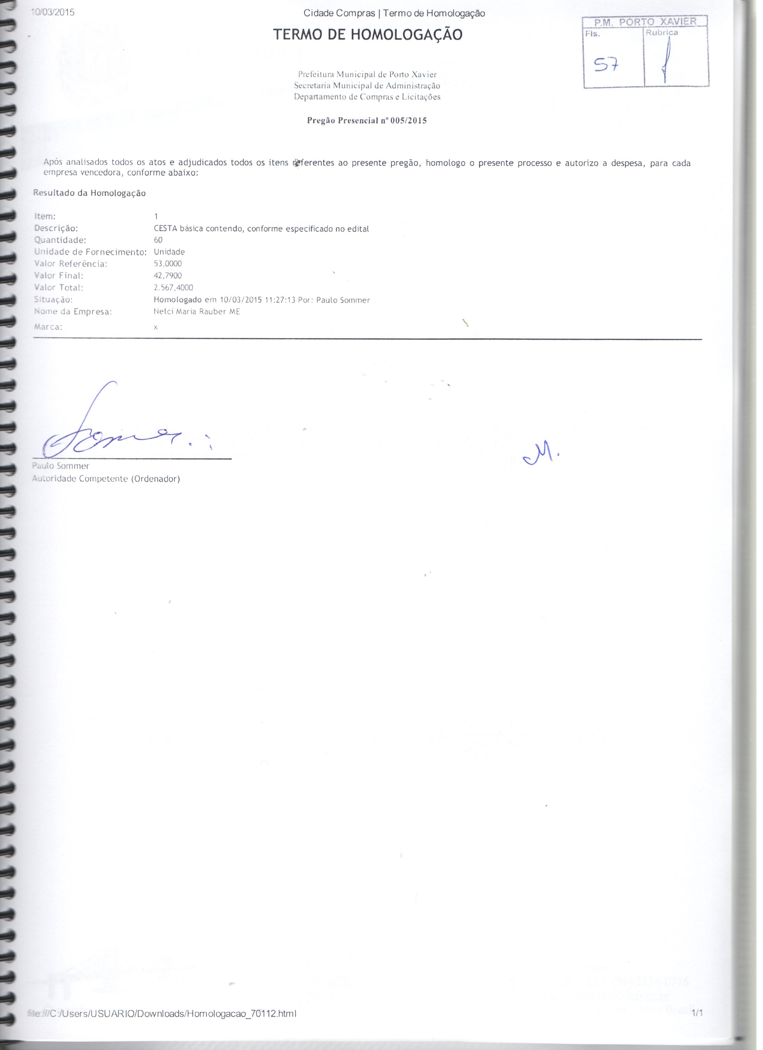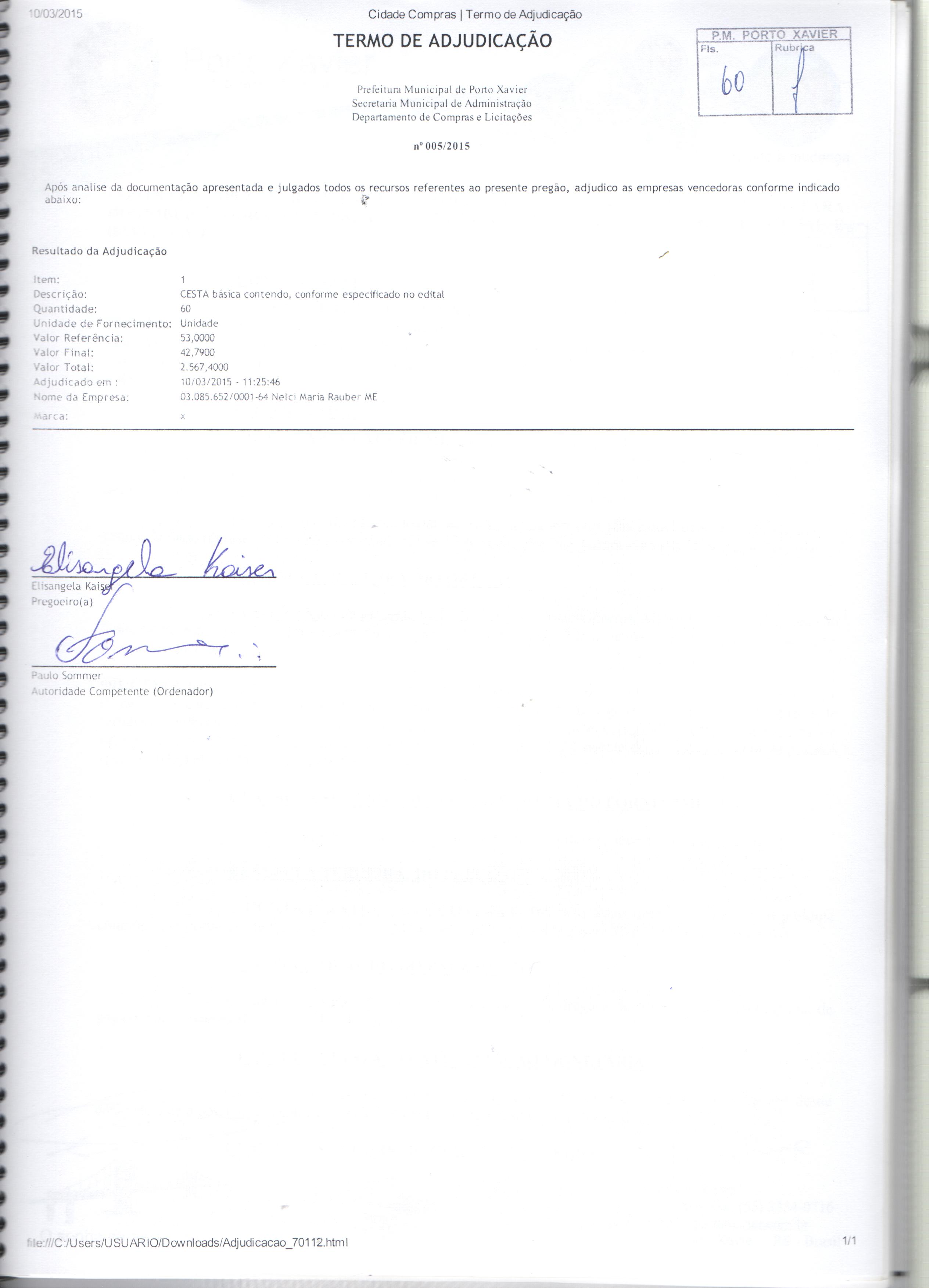 Descrição: Termo de Homologação, Adjudicação e Ata do Pregão Presencial 005-2015