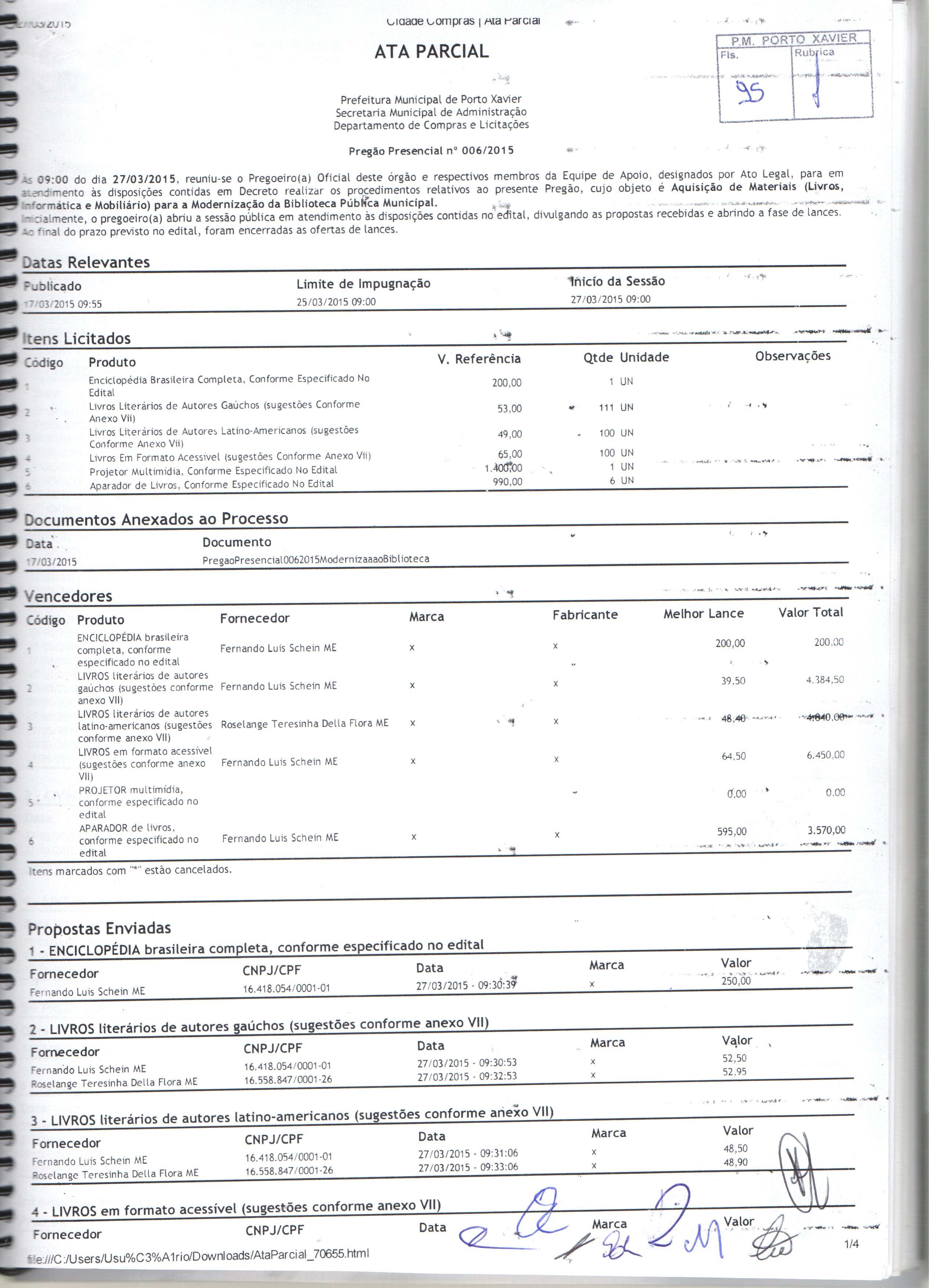 Descrição: Termo de Homologação, Adjudicação e Ata do Pregão Presencial 006-2015.