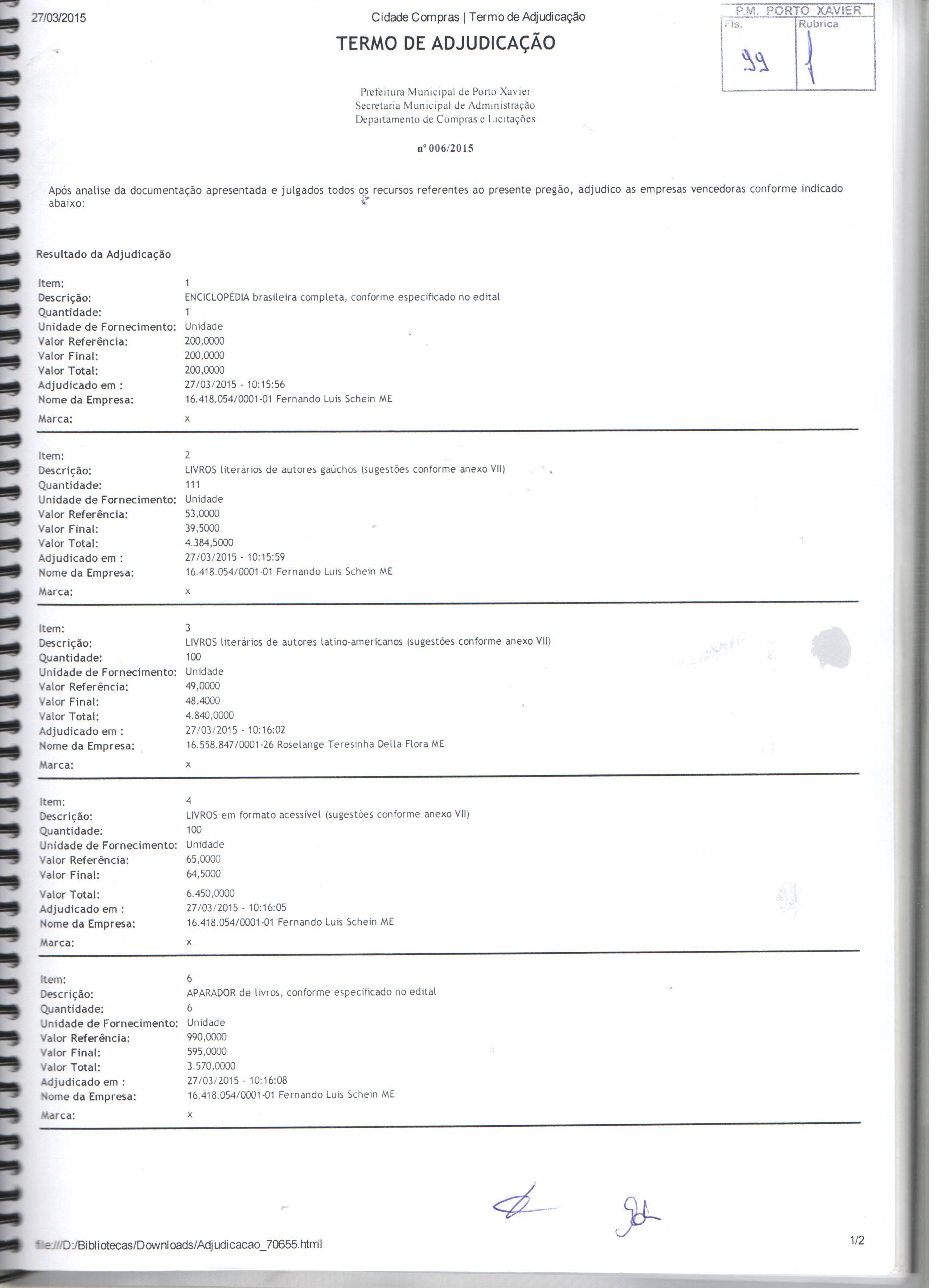 Termo de Homologação Adjudicação e Ata Pregão 006-2015