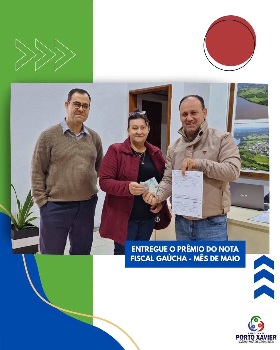 Foi realizado no dia 29 de maio o sorteio do programa “Nota Fiscal Gaúcha”, e o contemplado na extração, Sorteio Municipal de Porto Xavier foi Noeli Fracalossi Rotta, portador do Bilhete nº 33.862. A entrega do prêmio de R$ 300,00 (trezentos reais) referente ao mês de maio, foi realizada nesta sexta-feira, 13 de junho.