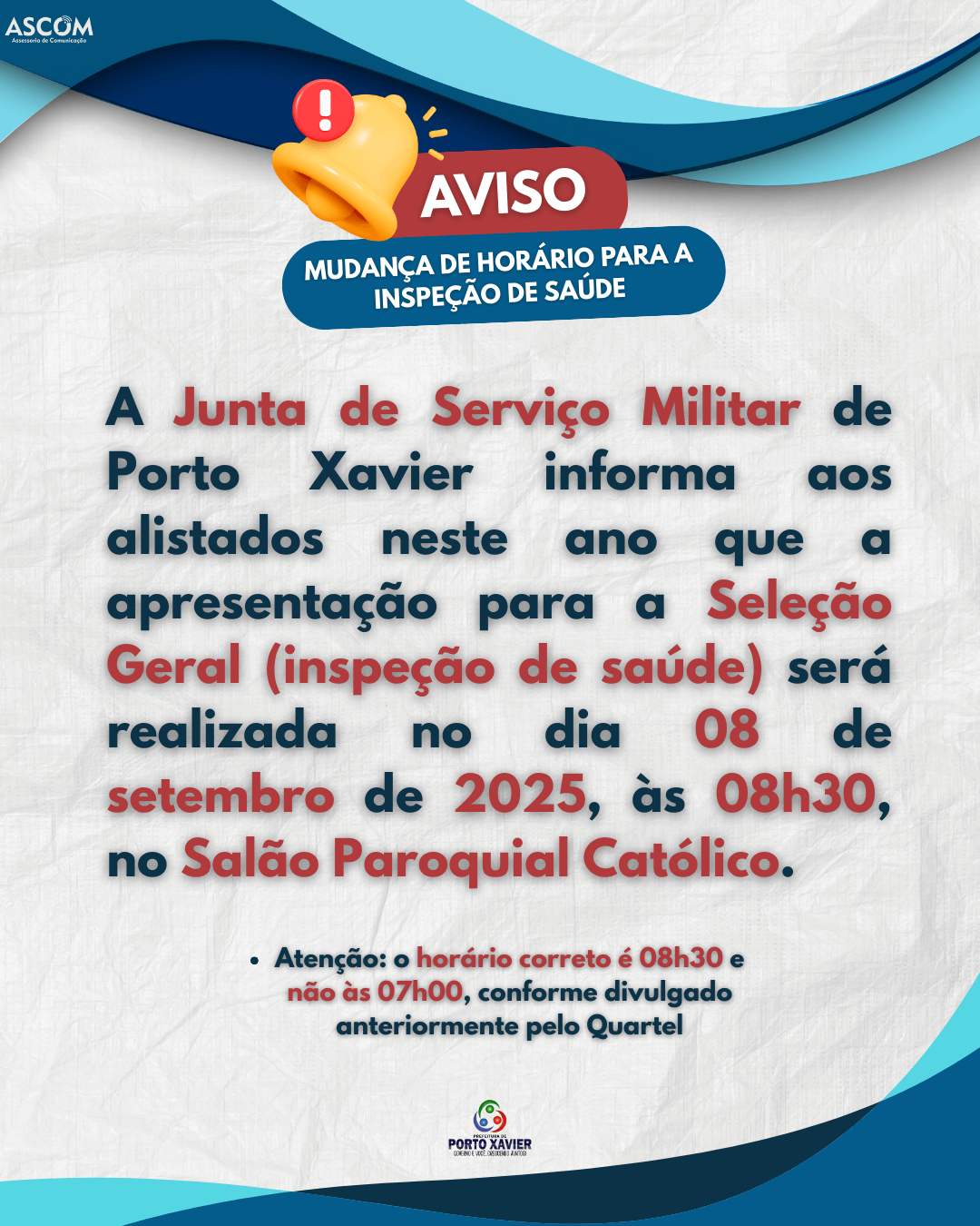 A Junta de Serviço Militar de Porto Xavier informa aos alistados neste ano que a apresentação para a Seleção Geral (inspeção de saúde) será realizada no dia 08 de setembro de 2025, às 08h30, no Salão Paroquial Católico.