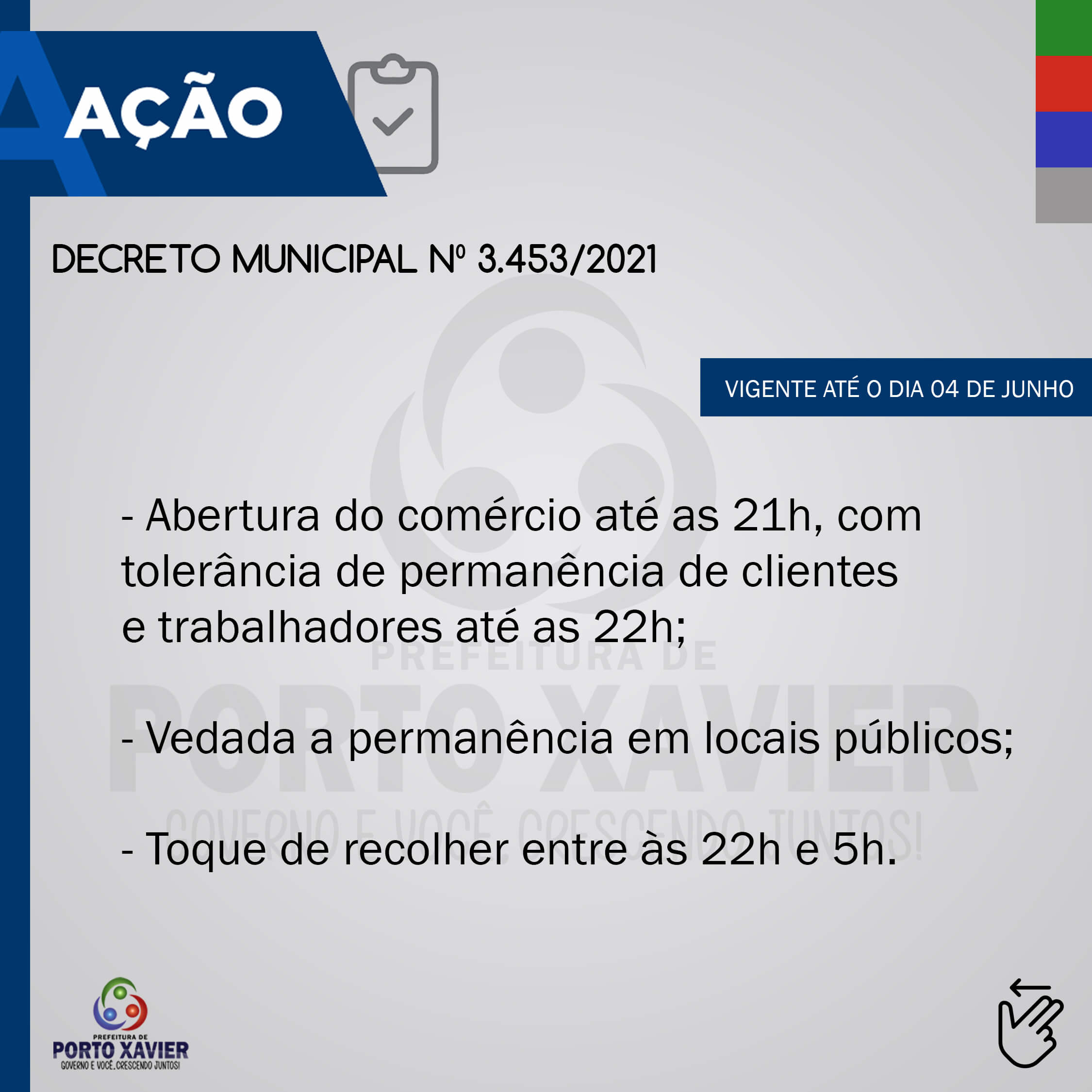 Diante do atual cenário da pandemia de Covid-19, a Administração Municipal editou e assinou um novo decreto que dispõe sobre medidas preventivas. Com a edição do Decreto N° 3.453/2021, as definições podem ser acompanhas em anexo.