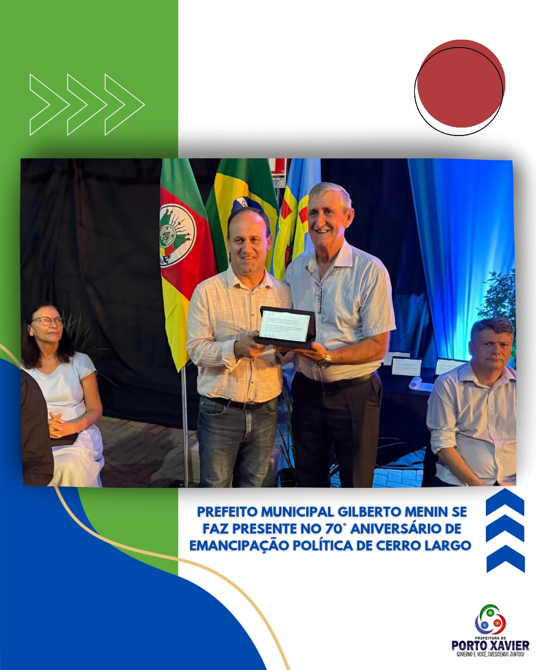 Na última sexta-feira, 28 de fevereiro, o Prefeito Gilberto Menin, acompanhado do Secretário do Turismo Ovídio Kaiser, esteve na cerimônia comemorativa aos 70 anos de emancipação política de Cerro Largo. No ato foi homenageado o município de Porto Xavier e os demais municípios que integravam Cerro Largo.