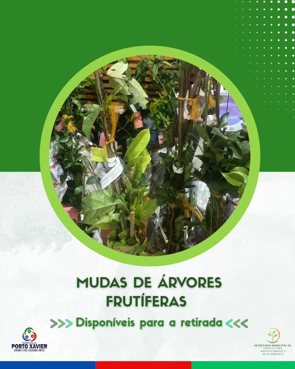 A Secretaria Municipal da Agricultura, Abastecimento e Meio Ambiente, informa aos munícipes que realizaram suas encomendas, que já estão disponíveis para a retirada as mudas de árvores frutíferas.
