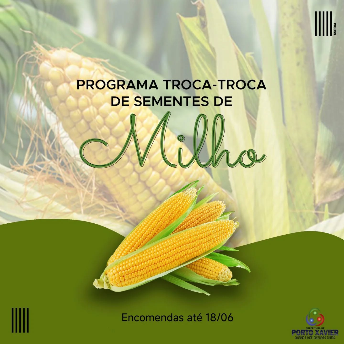 A Secretaria de Agricultura, Abastecimento e Meio Ambiente de Porto Xavier informa que os pedidos de milho Safra 2025/2026, do Programa Troca-Troca de Sementes, iniciam hoje 10 de junho e seguem até o dia 18 de junho. Os pedidos podem ser feitos na referida secretaria, levar documentos pessoais e a CAF/DAP ativa.