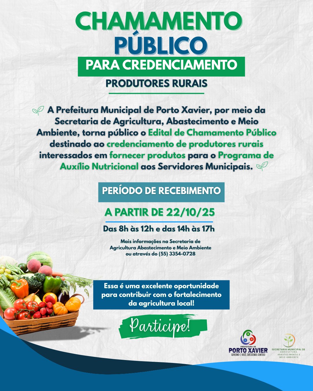 A Prefeitura Municipal de Porto Xavier, por meio da Secretaria de Agricultura, Abastecimento e Meio Ambiente, torna público o Edital de Chamamento Público destinado ao credenciamento de produtores rurais interessados em fornecer produtos para o Programa de Auxílio Nutricional aos Servidores Municipais.