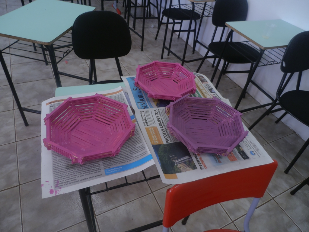 Buscando aprimorar as práticas artísticas e artesanais com o grupo, foram realizadas atividades de confecção de descansos de panelas e bandejas com jornais, além de cestas com palitos.