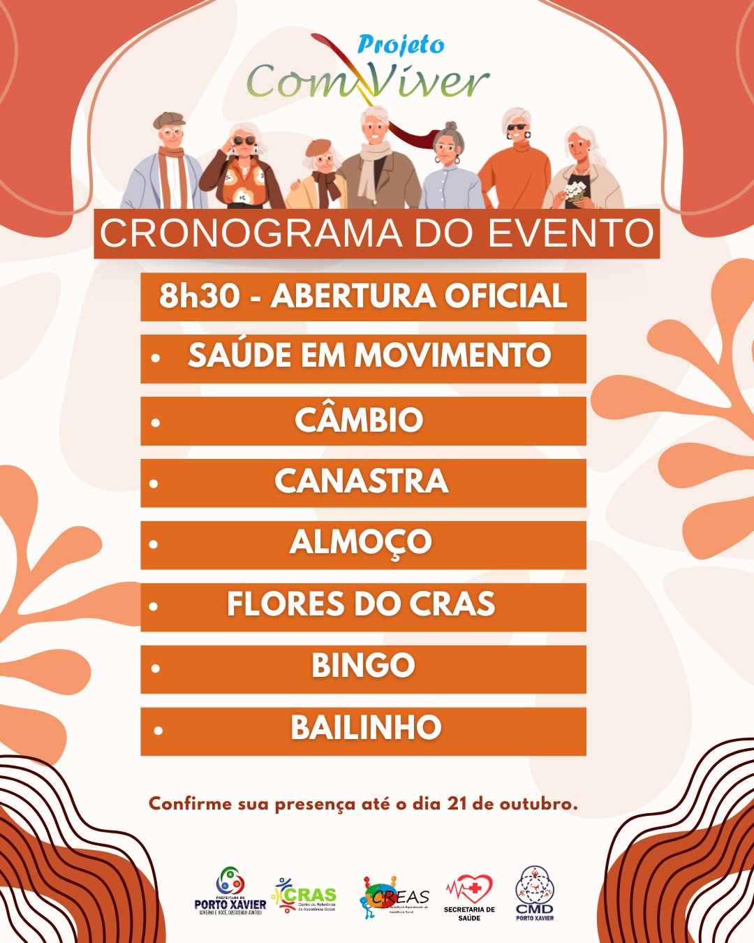A Prefeitura Municipal de Porto Xavier, por meio da Secretaria Municipal de Assistência Social e CRAS, tem a honra de convidar todas as pessoas idosas, com 60 anos ou mais, para participar do Evento Alusivo ao Dia Internacional da Pessoa Idosa.