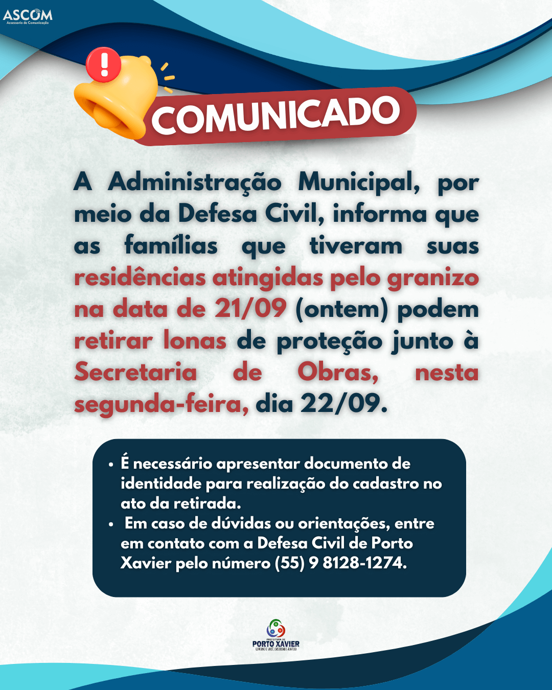 📞 Em caso de dúvidas ou orientações, entre em contato com a Defesa Civil de Porto Xavier pelo número (55) 9 8128-1274.