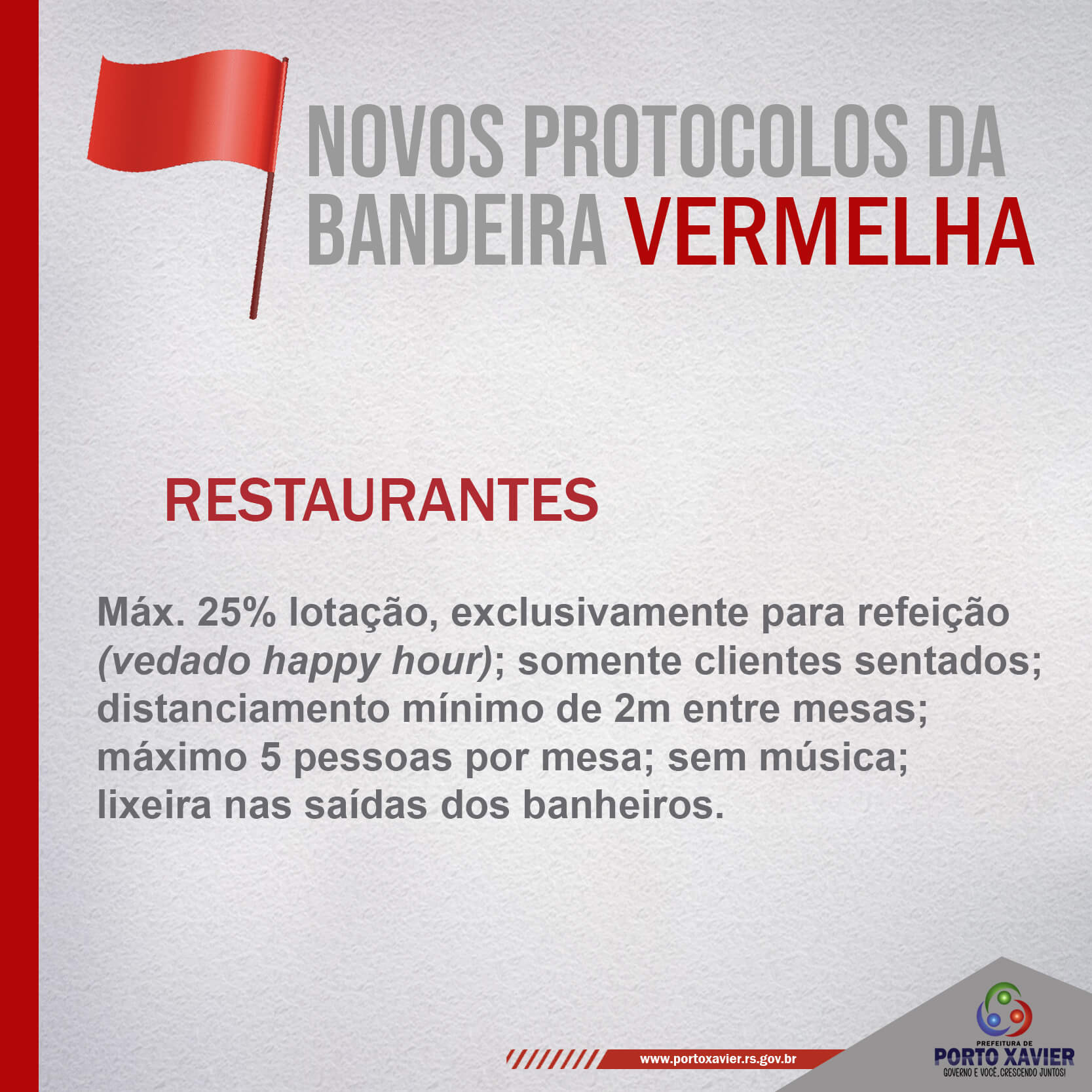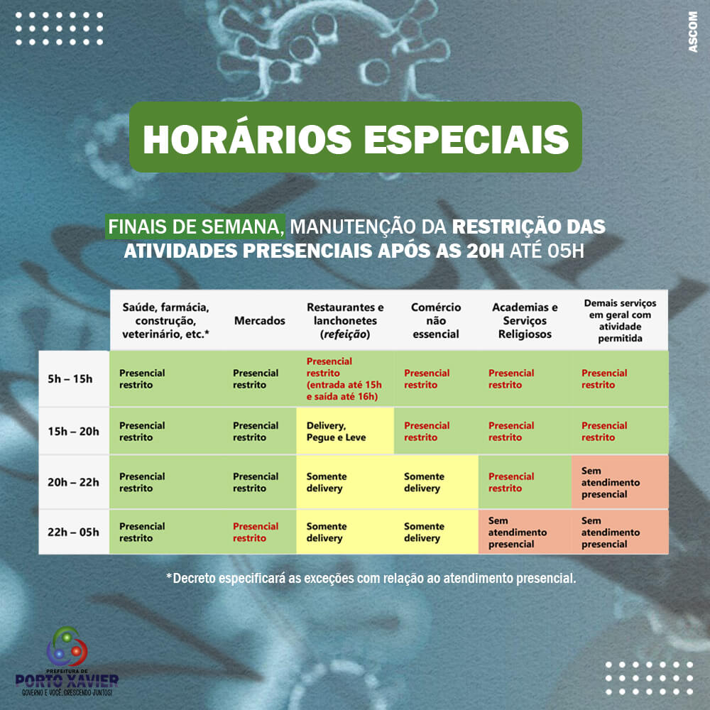 Conforme divulgado em Decreto Estadual, ocorreram alguns ajustes nos protocolos substitutivos da bandeira vermelha, possibilitando o funcionamento de alguns serviços, bem como a definição dos horários especiais de funcionamento das atividades durante a semana e também aos finais de semana. Essas novas medidas atendem à necessidade de garantir fôlego às atividades econômicas já bastante atingidas pela pandemia. Salientamos que todos os cuidados de prevenção ao coronavírus, devem ser seguidos, como o uso de máscara, uso de álcool em gel e evitar aglomerações. Confira as alterações: