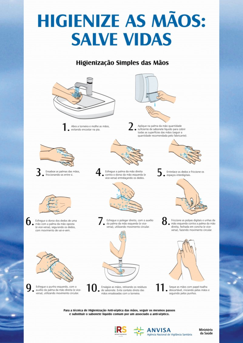 • Lavar as mãos frequentemente, até a metade do pulso, higienizar as mãos com álcool gel. Tossir ou espirrar levando o rosto à parte interna do cotovelo, ou usar lenços descartáveis;